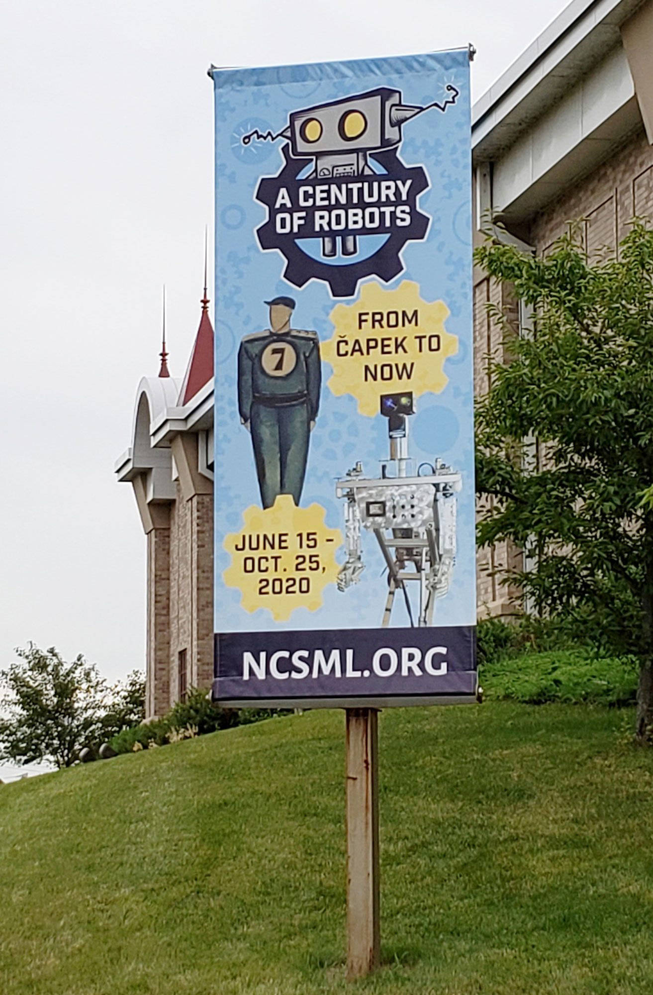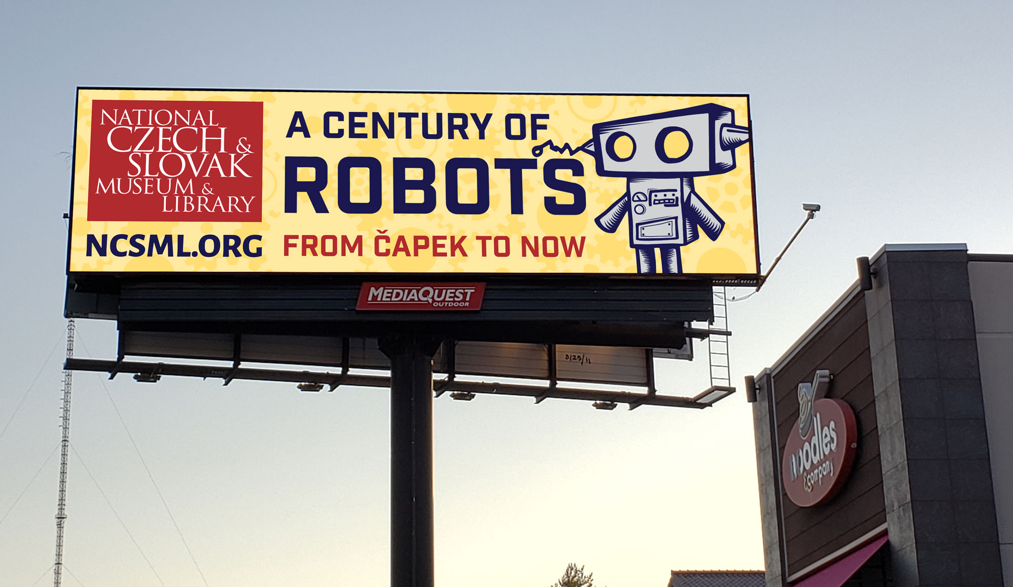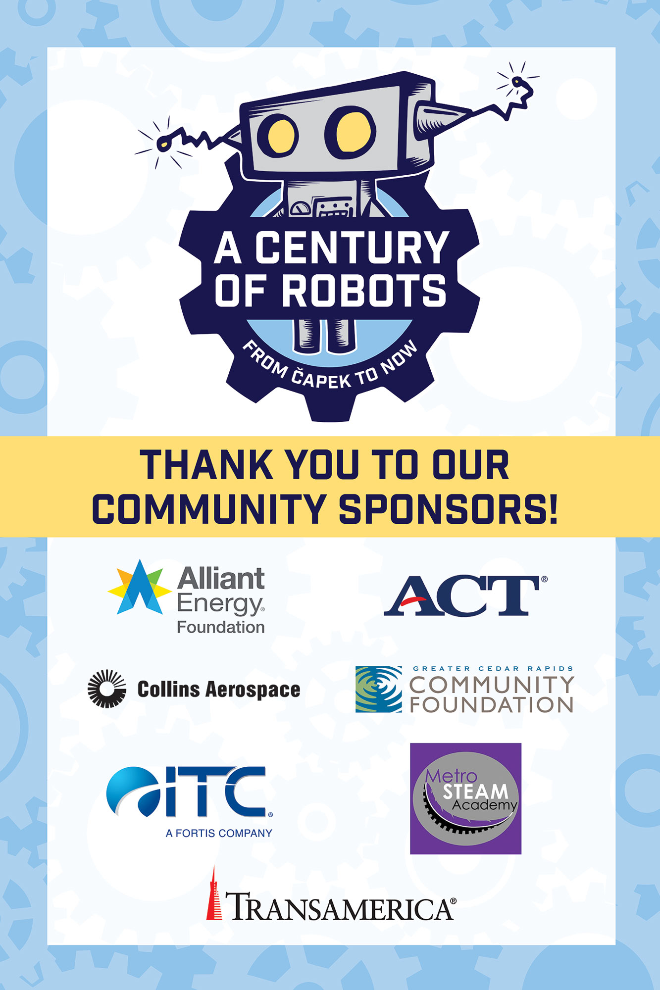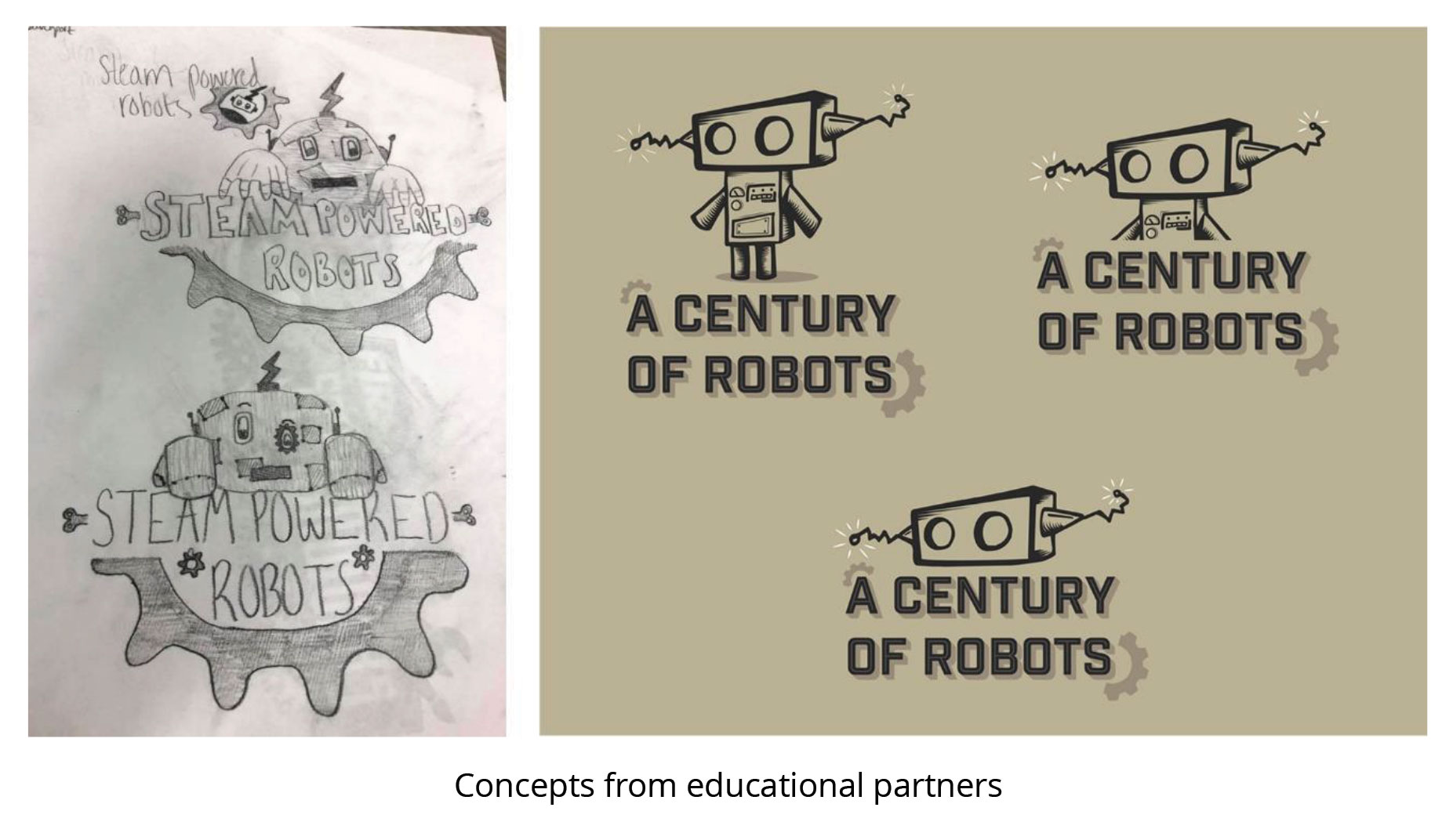 Working with students from both Iowa BIG and Metro Steam Academy, Metro Steam Academy drew preliminary sketches from which Iowa BIG students created a digital concept on a branding project for the original NCSML exhibition. From these ideas, I developed the final logo and further marketing materials for the exhibit that celebrated the 100 year anniversary of Czech playwright, novelist, and journalist Karel Čapek introducing the word robot. A Slavonic word deriving from “robota”, which means servitude, forced labor, or drudgery, robotics has become an all-important fixture in our lives.